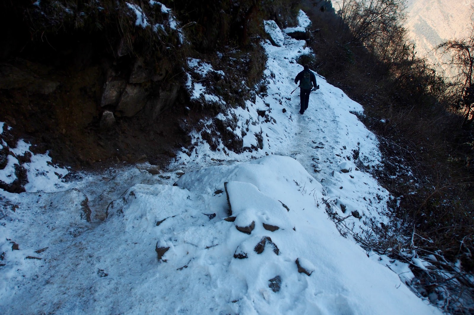 Tentokrát jsem od začátku věděl, že půjdu vyloženě z guesthousu do guesthousu. Nepotřeboval jsem tedy s sebou nic na kempování. Váhal jsem akorát s tím, jestli si vzít teplý spacák, který by zabral hrozně moc místa v mojem batohu, nebo jen lehký půlkilový. Nakonec jsem se rozhodl pro druhou možnost a dobře jsem udělal. V sezóně by to bylo asi dost riskantní, protože všechny guesthousy jsou plné a deky používají průvodci a nosiči, kteří si s sebou nic na spaní neberou. Mimo sezónu má každý k dispozici tolik dek a peřin, kolik jen potřebuje.
