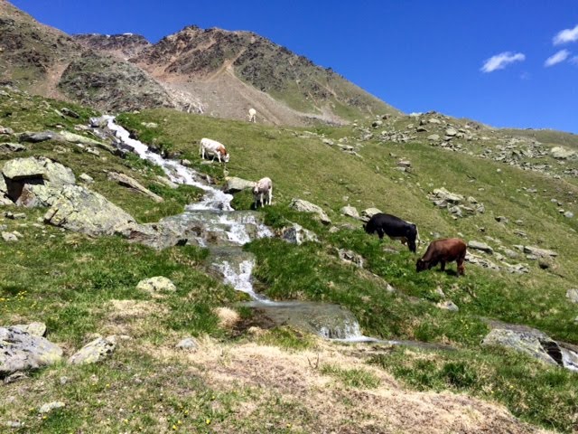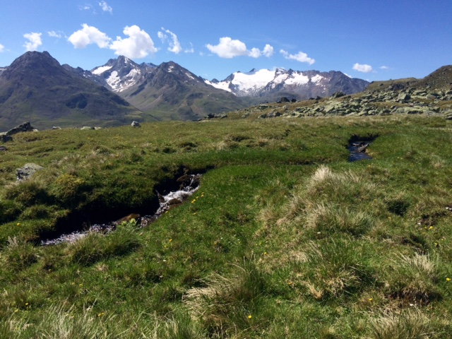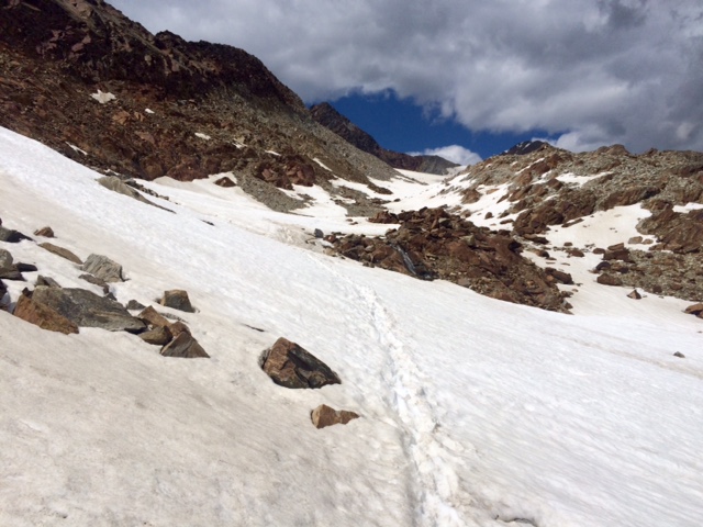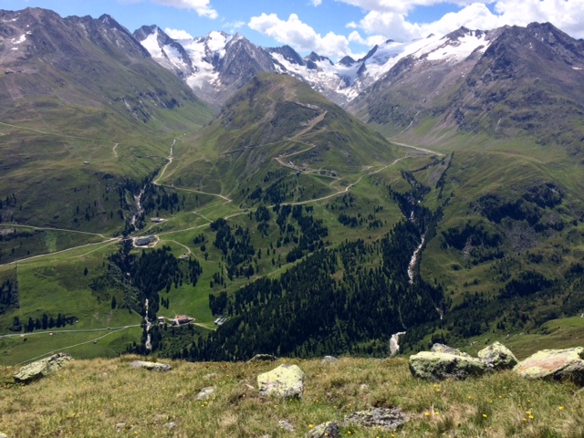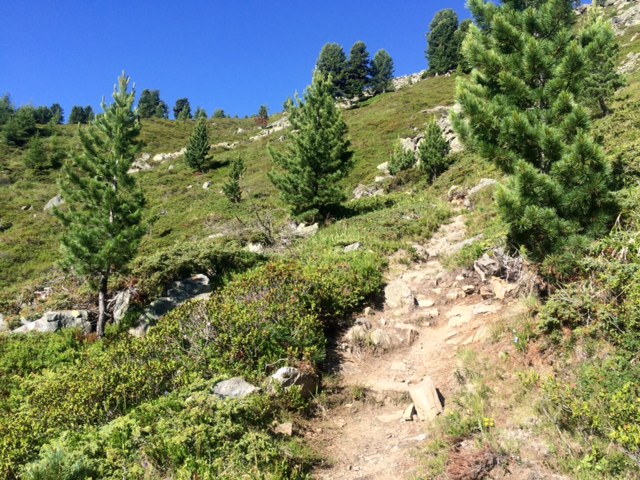 Cesta vede pořád nad údolím směrem na jih k velkým horám. Takhle jsem si to představoval. Krásná procházka. Pořád je to lehce hore dole a pak asi 200 m dolů, kde se to navazuje na hlavní cestu z Obergurglu na Ramolhaus.