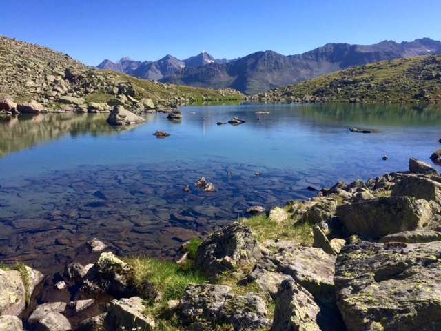 Volím cestu nad údolím řeky Gurgler Ache. A bylo to správné rozhodnutí. (V této části bylo totiž víc možností.) Za 1 hod 40 min vystoupám 900 m k jezeru Nedersee (2400 m). Je krásně, nefouká, nikdo tu není, tak se rozhoduju chvíli zůstat. Přeperu kompresní podkolenky, kraťasy a triko. Koupu se. Pak se trochu sluním. Po 45 min opět vyrážím.