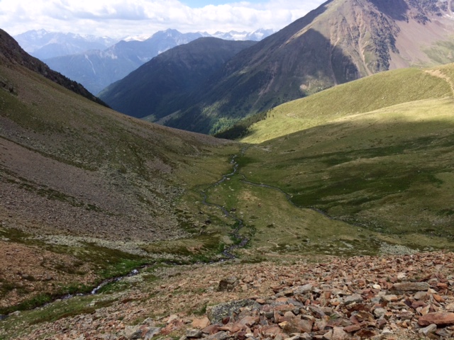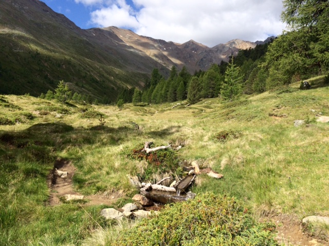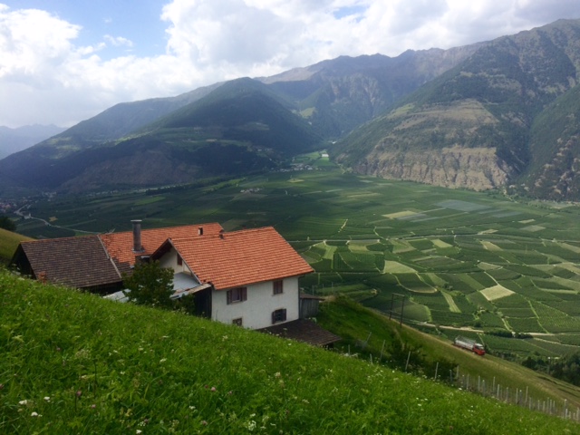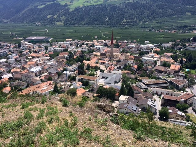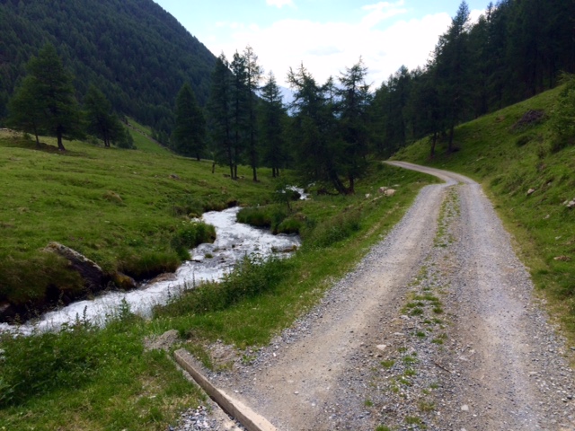 Dál pokračuje příjemné klesání prve po louce a pak lesem až do asi 2000 m, kde se napojím na štěrkovou cestu, to už moc příjemné není. Ale pořád lepší než asfalt. Tahle cesta mě dovede skoro až do Schlanders (750 m). Takže to bylo souvislé klesání 2000 m. To je docela dost. Ale z toho unavenej nejsem, víc mě zmáhá šílenej hic, kterej je ve městě.