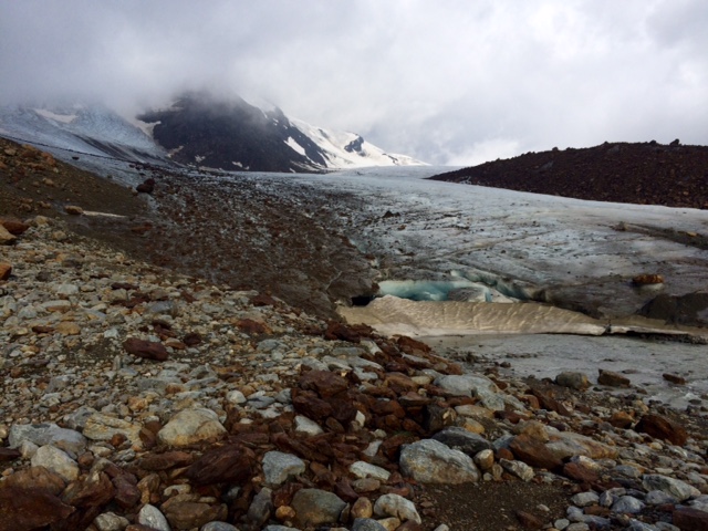 Já mám zatím viditelnost docela dobrou. Akorát jak v noci pršelo, tak všude přes cestu tečou potoky vody. Ale to neva. Pak následuje takovej nic moc úsek, kde už pode mnou je led a je to trochu ve svahu a já musím skákat ze šutru na šutr. No a pak přijde travers ledovce. Tady už je mlíko, ale naštěstí stopy jsou jasné. Je to jen pár set metrů.