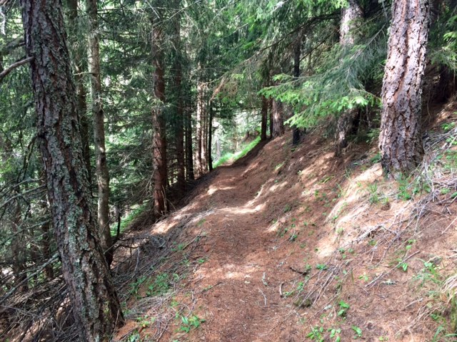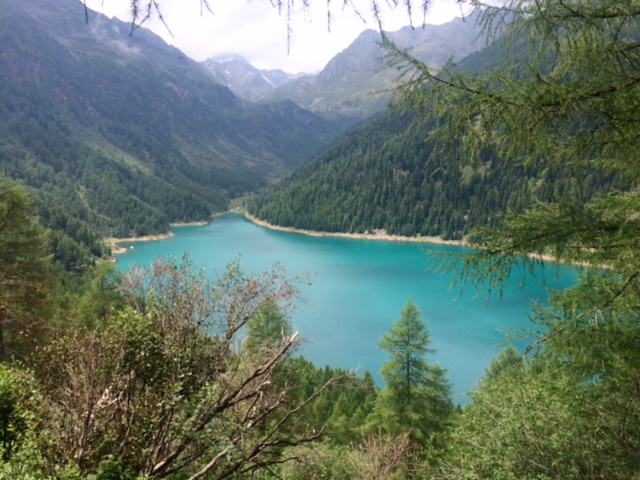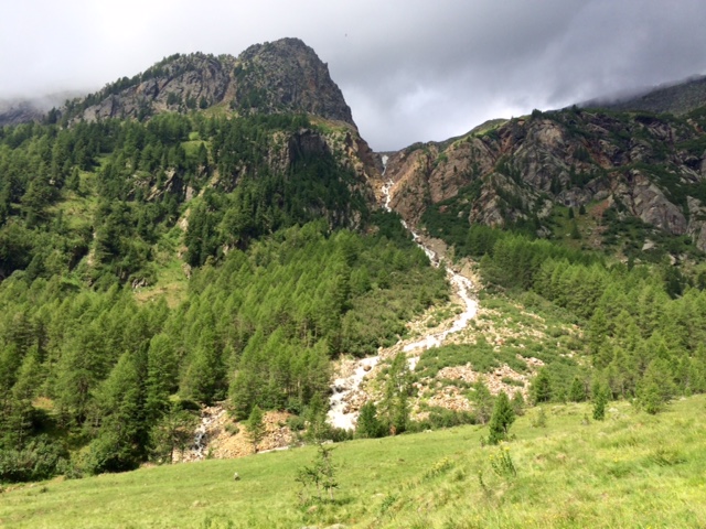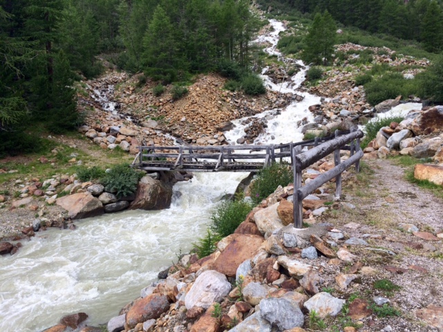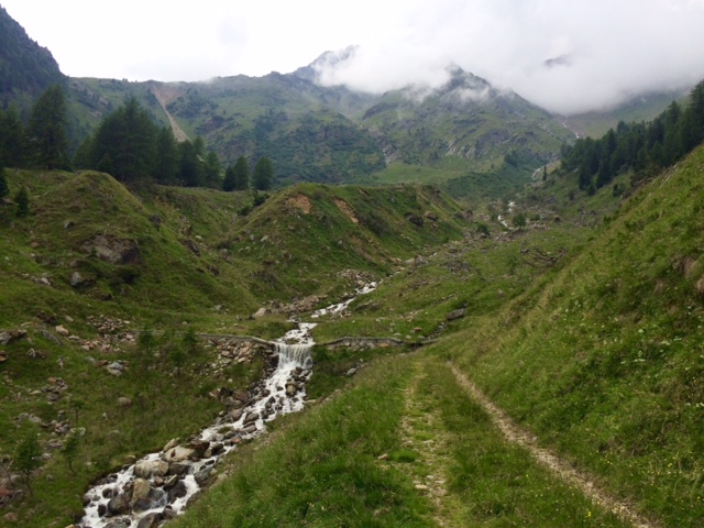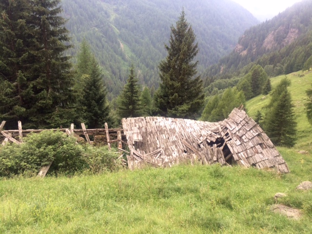 Pak na rozcestí zvolím takovou opuštěnou cestičku a ta mě dovede k ruině statku. Kam dál? Kousek sejdu přímo dolů po louce a napojím se na nějakou cestu. A pak je tu rozcestí. Buď rovně a budu muset ještě vystoupat 200 m, než sejdu dolů k přehradě Lago di Pian Palù, kam mířím. Anebo sejdu rovnou dolů k řece a silnici, která tam taky vede.