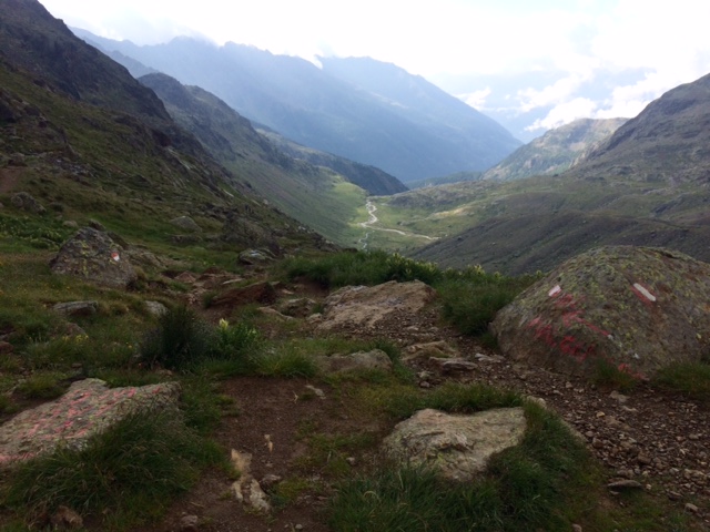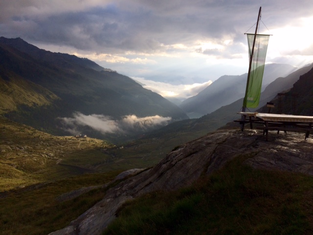 Snídaně je od 6, takže budík 5:35. Vůbec se mi nechce. Ale spát můžu doma, že jo. Za chvíli se na snídani přidávají i moji spolunocležníci Němci. Ale nálada je všelijaká. Původně mělo podle předpovědi být ráno docela hezky a od 11 pršet. Ale teď ráno se prý předpověď zhoršila a výhled z okna vypadá bídně. Kopce v mlze. I moje sedlo Fürkele ve 3000 m.