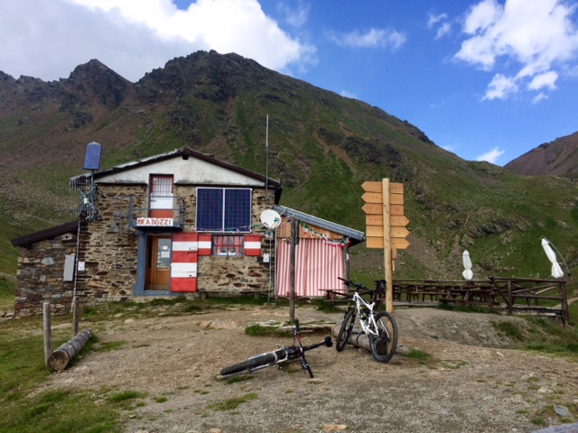 V sedle jsem ve 4 a pak už je to do chaty tak 10 min. Je to malá chatička. Rifugio Bozzi (2478 m). Je tu chatař a nějaká baba, která brzo odejde. Taky pár bajkerů, těch jsem potkal po cestě dost. Dneska tu budu jedinej host.