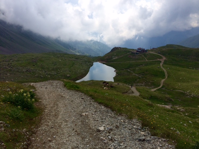 Jsem na okraji přehrady. Teď mi začne závěrečné stoupání. 800 m do sedla 2671 m. Jsou 2 hodiny odpoledne. Moc se mi do toho nechce. Dneska mám takovej línej den. Spousta zastávek a tak.
