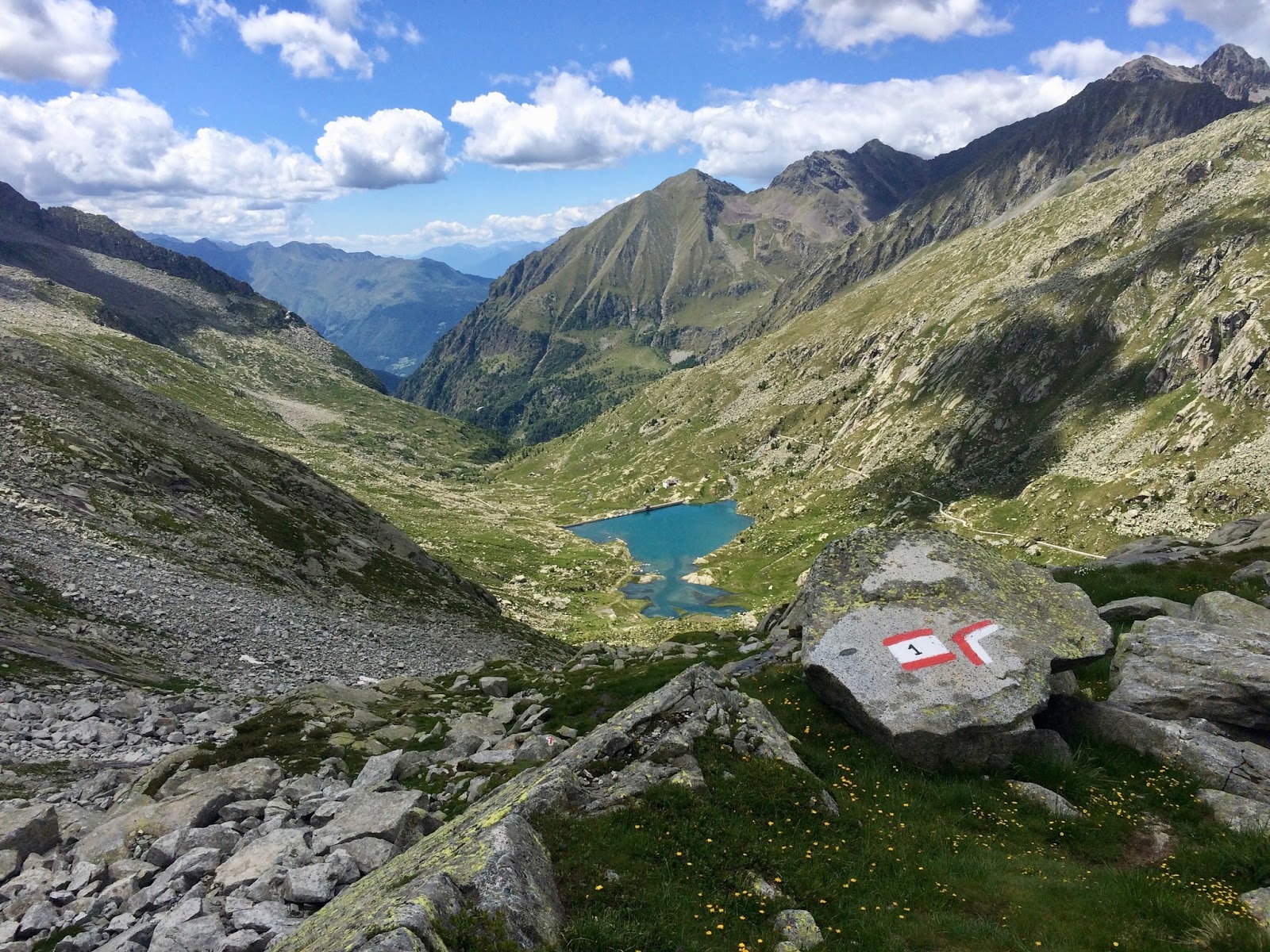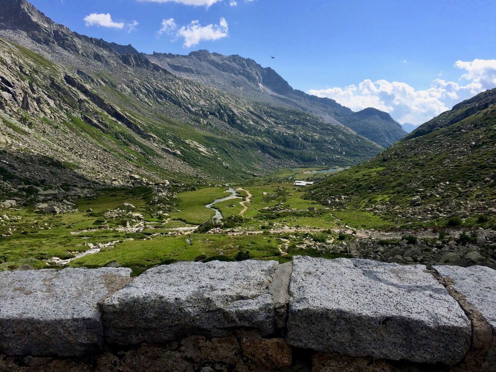 Pohled do údolí z terasy chaty Prudenzini. Já jsem přišel ze sedla vpravo a další den šel do sedla nalevo