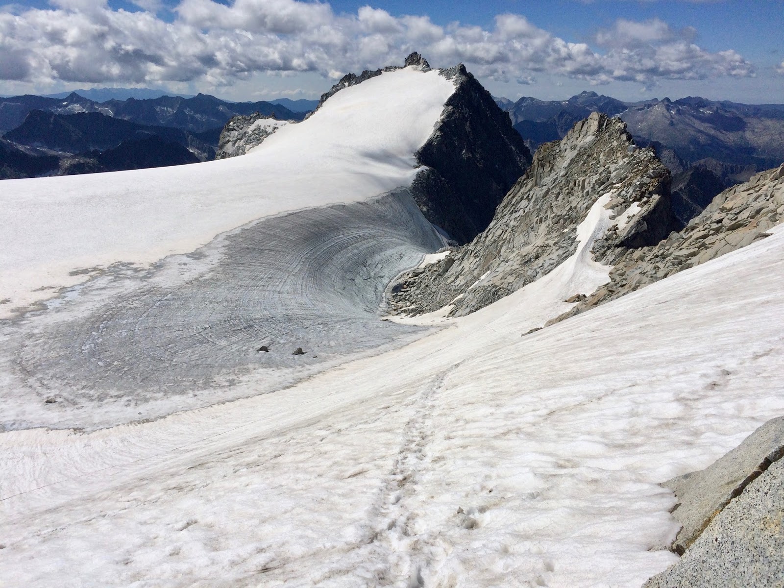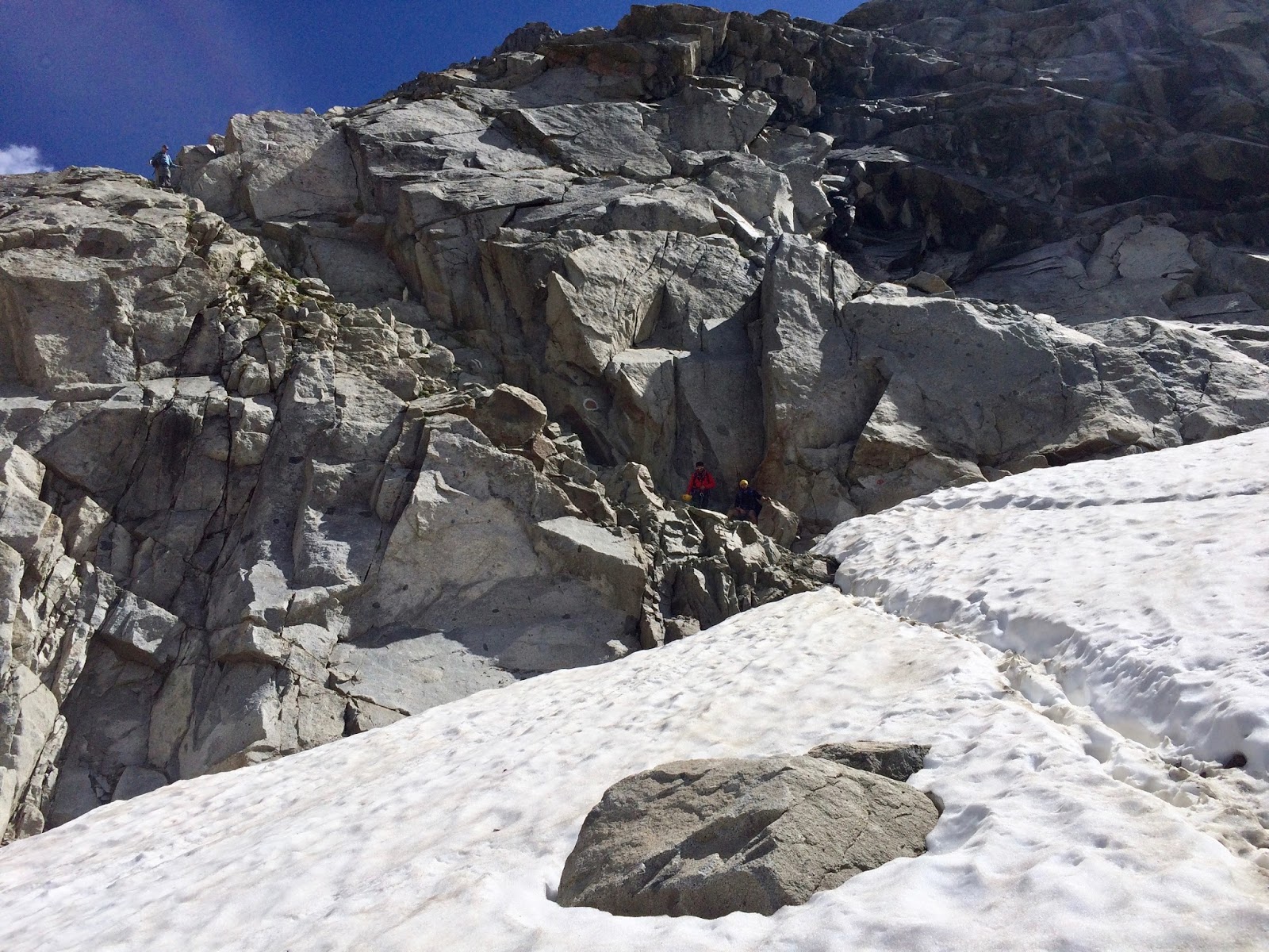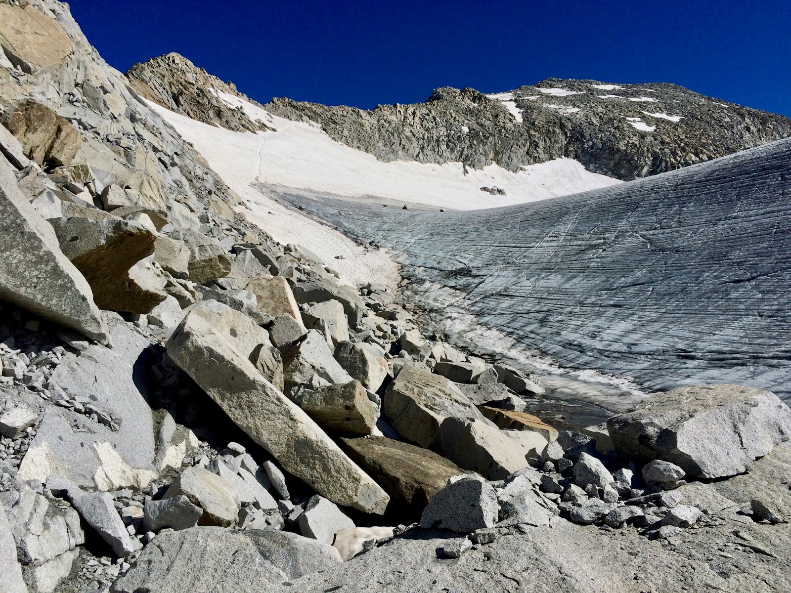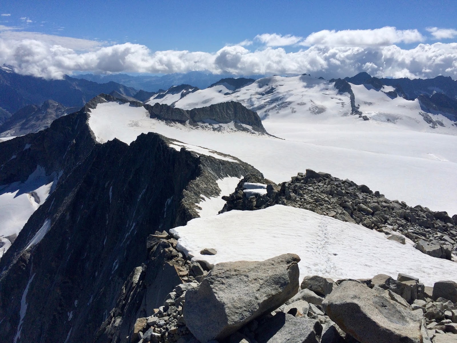 Nahoře v sedle jsem najednou viděl ten obří ledovec v celé své kráse. Snad jsem ještě na vlastní oči neviděl větší. Teda pokud se bavíme o Alpách. No dobře, asi v okolí Mont Blanku, ale to je dávno. Taková krásná sněhová pláň. Prve se šlo vlevo po šutrech vedle ledovce. A pak vyšlapanou cestičkou přejít asi tak 200 m po ledovci. Jak tohle skončilo, tak zbývalo ještě nějakých 15-20 min po šutrech až k vrcholu. Pár minut před vrcholem jsem potkal ty 4 z naší chaty, jak jdou dolů.
