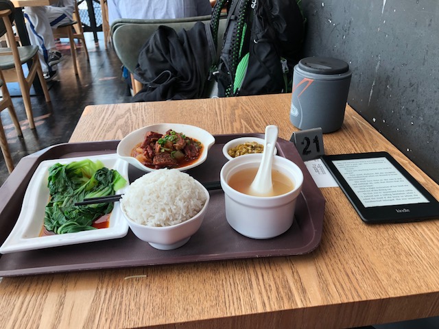 Na letišti mám spoustu času. Dávám si oběd – rýže a hovězí maso a nějaká zelenina. Je to dobré a ani to není moc drahé – okolo 200 Kč.