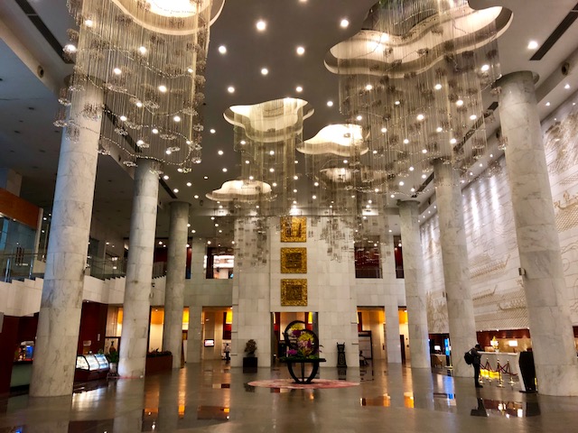 Ubytování bylo domluveno a za 10 minut jsme vyrazili mikrobusem ještě se dvěma dalšími Číňany. Cesta trvala asi půl hodiny. Hotel je pěkně hogo fogo. Už jen to vstupní atrium, wow!