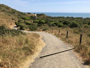 Plážový úsek končí. Pokračuje pár km v takovém travnatém kopcovitém parku hned vedle pobřeží. Už jdu přes 30 km, tak přemýšlím, kde dnes skončím. Moc nikde není kde zakempovat.