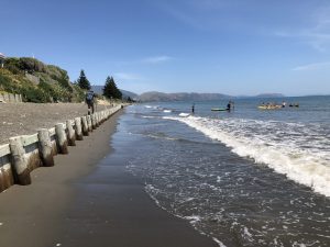 Těsně před pláží jsem potkal dalšího chodce, co jde TA. Je to šedesátník Bob, o kterém už jsem slyšel od Saši. Jde pomaleji, tak ho prozatím předbíhám. Stezka pokračuje nalevo po pláži dalších 8 km. Moc lidí tu není, jen občas někdo. Pro mě je moře vzácnost, tak si to docela užívám navzdory vedru.