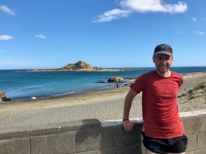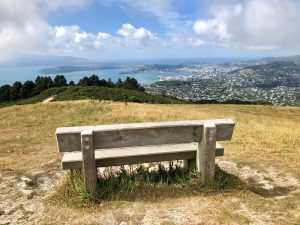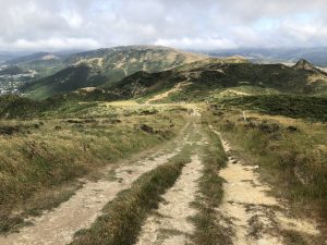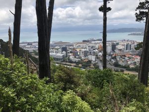 Přede mnou je pár set metrů stoupání na Mt. Kaukau. Šíleně fučí. Občas skoro nejde jít. Otevírá se pohled na Wellington a sousedící moře.