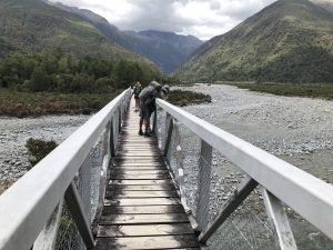 Po levé straně silnice vede železnice. Tu přejdeme a pak pěším mostu přejdeme přes řeku. Tentokrát je to most pro 5 lidí, ale na konci se sejde dolů jako na visutém mostu a to je pouze pro jednoho člověka. Most se jmenuje Morrison Foot Bridge.