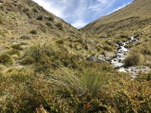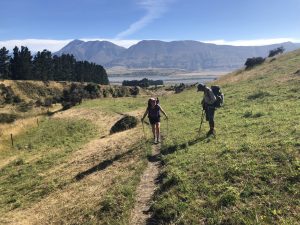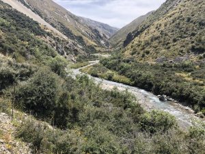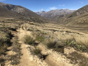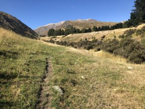 Na startu jsme těsně po deváté. Zapíšeme se Richardovi do deníčku, rozloučíme se a můžeme vyrazit. Ani jsem se tentokrát předem nedíval, ale ukazuje se, že nás na začátek čeká hezkých 500 m stoupání. Byla to hezká stezka, líbilo se nám to. A otevíraly se nám hezké výhledy na řeku Rakaia a za ní vysoké hory.