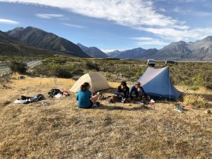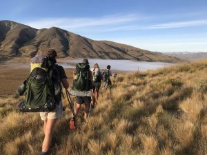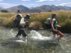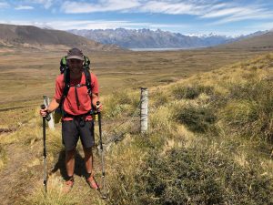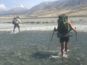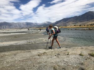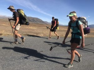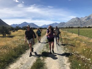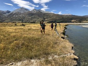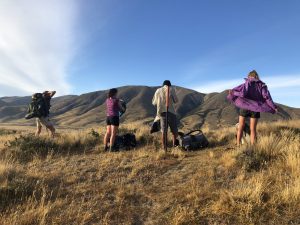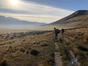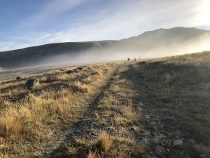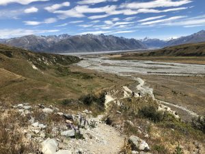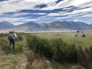 Vyrážíme v 6:30 – David, Lauren, Luke, Francis a já. K řece Rangitata, kterou potřebujeme přebrodit, je to 33 km. Je to celkem snadná cesta, prve asi 7 km po polňačce, než se dostaneme na štěrkovou silnici. Po silnici pak dalších 5 km. A pak je to zase hezká stezka v takové planině. Postupně se nám otvírají výhledy na zasněžené jižní alpy. Je to paráda.