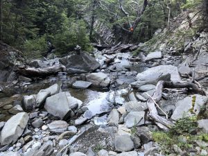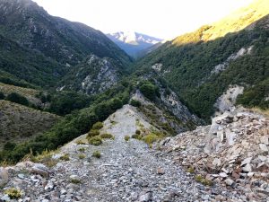 Cesta pokračuje dolů podél řeky Timaru. Ale ne přímo, to by bylo příliš snadné. Cesta vede lesem ve svahu nad řekou hore dole. Když dojdu po 12 km na odbočku, která vede nahoru k další chatě, tak mám už nastoupáno 500 m, přitom v ideálním případě jsem měl jít pouze dolů. První pauzu jsem dal několik km před odbočkou.