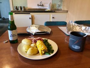 Když mám za sebou asi 25 km a očekávám už jen dalších 8, kouknu na mapu a zjišťuju, že to bude ještě aspoň 12! (Nakonec je to ještě o 2 víc.) Vystoupám ještě asi 100 m a pak postupně klesám až na štěrkovou cestu. Pak se ještě musím proplést několika pastvinami a konečně jsem na silnici. Odtud je to ještě asi 2 km k Birchwood Station. Je to farma, kde mají takovou chatku, která slouží jako hostel pro 10 lidí. Dorazím sem v 16:35. Jsem tu zatím sám, ale pozdeji přijde ještě Kanaďan Evan, co jde na sever. Ubytování je za 20 dolarů a večeře je za dalších 15. Je to sice jednoduché, ale chutné jídlo. Brambory, maso, vařená zelenina.