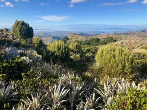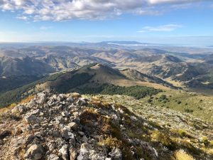 Venku je skoro modrá obloha. Je krásně. Pojďme na to! Cesta začíná v lese. Musím nastoupat 500 metrů. To už tu dlouho nebylo! Nestoupá to hned, ale až po pár km. Takže mi to od startu nahoru zabere možná hodinu a čtvrt. Je to příjemná cesta. Těsně před vrchem vylezu z lesa a hezky se mi otevřou výhledy dolů do nížin. Je tu i mobilní signál. A je tu zajímavý terén, taková kamenitá suchozem.