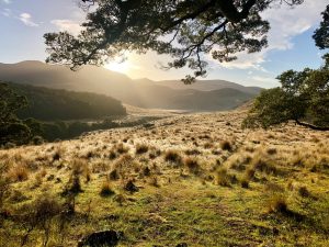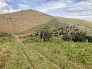 Mám za sebou asi 20 km. Pokračuju dál, stoupá to teď definitivně nad řeku přes pár kopečků. Tady potkám další 3 TA NOBO hikery. Pak v pastvinách potkám farmáře, kteří zrovna nahánějí stádo krav o kus vedle. Jeden borec jede s takovým terénním golfovým vozíkem a druhý jde o kus vedle se dvěma ovčáckými psy. Krávy se hýbou pomalu, takže se musím proplést mezi nima.