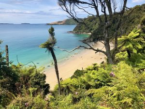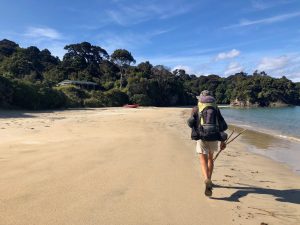 Stezka k první chatě je součástí Great Walku, takže je to dálnice. Většina je lesem a pár úseků je po pláži. Krásné pláži. Po cestě dojdu Luka, který jel lodí v 9:30, ale prve se dlouho zdržel ve Visitors Centru a pak si dal obědovou pauzu. Dál jdeme spolu.
