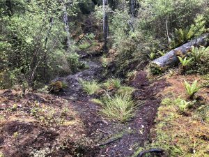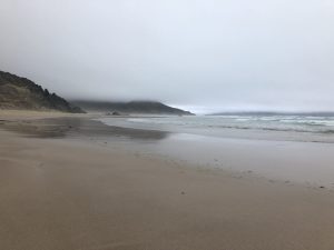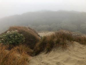 Pak pokračuju na závěrečný úsek. Je to převážně do kopce lesem. Asi hodinka až k chatě. Před chatou mě překvapí písečná pasáž – pás písku se táhne až dole od moře, přitom jsem ve výšce 200 metrů nad mořem. Docela tu fučí a jsem v mraku, takže vidím kulový. Vlhkost 100 %.