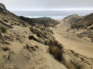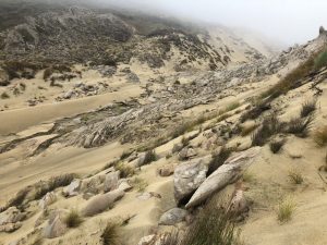 Pak pokračuju na závěrečný úsek. Je to převážně do kopce lesem. Asi hodinka až k chatě. Před chatou mě překvapí písečná pasáž – pás písku se táhne až dole od moře, přitom jsem ve výšce 200 metrů nad mořem. Docela tu fučí a jsem v mraku, takže vidím kulový. Vlhkost 100 %.
