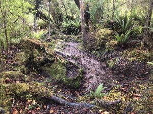 Dávám si dalšího šlofíka. Najednou se ozvou venku zvuky a je tu americký pár, co jsme je potkali včera na předchozí chatě. Je před třetí. Kouknu ven, neprší, ale je zataženo a déšť by mohl kdykoli začít. Třeba to takto vydrží. Rozhoduju se jít do další chaty. Sbalím se a v 15:20 vyrážím. Je to podle značení 7 hodin, takže počítám tak 4. Docela se mi to líbí, má to zvláštní atmosféru. Mrak je velice nízko. Možná i níž než 100 metrů nad mořem.