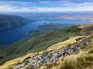 Když se dostanu zhruba do půlky, tak se mi otevře pohled na Lake Te Anau. Je to bomba! A výhled na jezero trvá celý zbytek stezky, dokud nezalezu do lesa po cestě dolů.