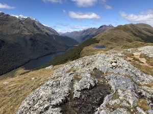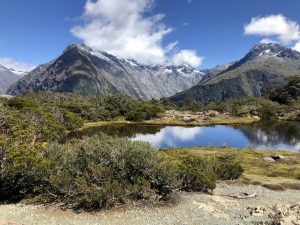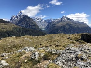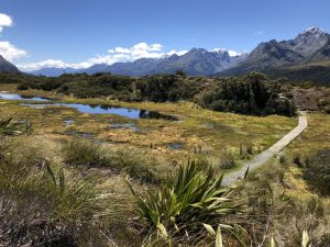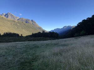 Je to neuvěřitelné, ale je modrá obloha! Vypadá to na krásný den! Cesta je pochopitelně trochu mokrá, ale to nevadí. Za hodinu a 15 minut jsem u Howden Hut. Odložím si batoh a jejda! Nemám karimatku! Jak jsem na ni mohl zapomenout? Když jsem se v jídelní místnosti balil, tak jsem ji položil pod lavičku a pak si jí nevšiml. Ale že jsem si nevšiml později, když jsem se obouval a batoh odložil na lavičku venku? To je divné.