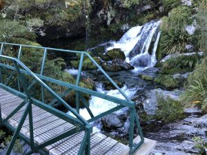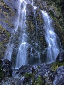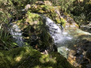 Někdy okolo 11:30 jsem v sedle. Trochu se posilním a rozhoduju se bez batohu běžet až na Routeburn Falls Hut. Jsem tam ve 12:05. No nic, tak nezbývá než se vydat zpět. V Intentions Book jsem viděl zapsaný katalánsko-belgický pár, co jde TA SOBO. Hned jak se začnu vracet k sedlu, tak potkám pár, co tak vypadá. Tak se zeptám a ano, jsou to oni. Tak kecáme. Obědvali na chatě se Sárou, ale ona odešla 10 minut před nima. Tak to bylo docela těsně. Ukazuje se, že začínali s Davidem a Lauren a jsou v kontaktu a D+L se s nima před pár dny potkali ve Wanace.