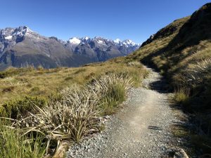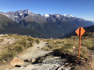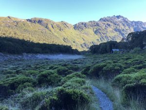 Vyrážím v 7:30. Jsem se Sárou domluvenej, že ji dojdu po cestě. Ona totiž z Howden Hut chtěla vyrazit v 6. Jde až na konec Routeburn Tracku a já plánuju jít k sedlu Harris Saddle a pak dolů po Deadmans Track až do údolí, kde na konci začíná Hollyford Track.