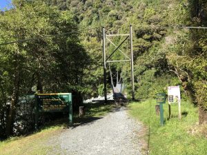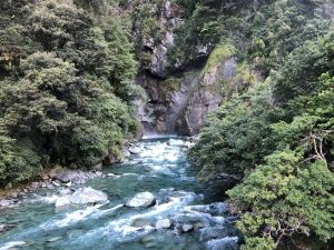 Asi v 17:20 se dostanu na štěrkovou cestu dole v údolí. Na začátek Hollyford Tracku je to ještě 7 km. Po kilometru mi naštěstí zastaví auto a doveze mě až na konec silnice.