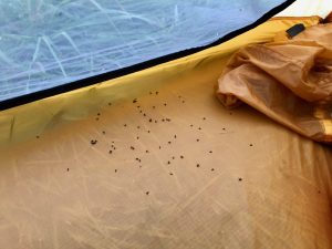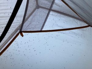 Kolem deváté se ukládám ke spaní a mám obavy ze sandflies. Rozhoduju se, že bude jistější spát ve stanu. Postavím ho před chatou. Problém je, že ačkoli se snažím být rychlej, jakmile vlezu do stanu, tak je tam se mnou asi 100 sandflies. Musím je jednu po druhé zabít. Pak mám konečně klid. Zvenku na stan útočí stovky tohoto krvelačného hmyzu. Zní to jako mrholení, což je příjemný zvuk, ale ne když člověk ví, že jsou to sandflies. Přestane to asi o půl jedenácté.