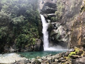 Zpět u chaty Hidden Falls Hut jsem před jednou hodinou. Odložím si batoh a jdu se ještě podívat k tomu schovanému vodopádu. Je to asi 1,5 km daleko. Je famózní. Místo, kam se dá dojít nejblíž k vodopádu, je celé promáčené – trvale tu mrholí. Tak to má být!