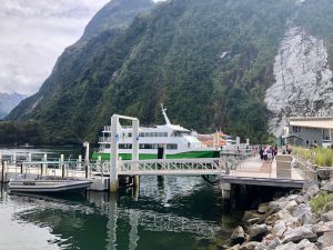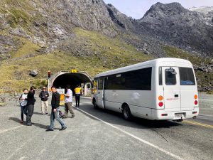 Jedeme prve na hlavní silnici, kde doleva na jih je to asi hodinu do Te Anau a doprava na sever vede silnice až k Milford Sound – hlavní atrakci v okolí. Je to takový úzký záliv s prudkými svahy hor všude okolo. Byl jsem poučen, že ve skutečnosti to není sound, ale fjord. Sound by byl vytvořen řekou a fjord je vytvořený ledovcem. Jedeme tam. Trvá to ještě asi hodinku. Cesta je to krásná. Prve se stoupá až do 800 m a pak se vjede do 1200m dlouhého tunelu a klesá se až k moři. Jsme tu relativně brzo, ale k tak jsou tu mraky turistů, je to šílený. Nejbližší parkoviště už je plné, musíme trochu zpět.