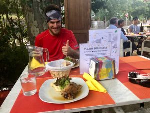 Za dalších pár minut jsme došli do města a zapadli jsme hned do první restaurace, co jsme potkali. Zlákalo nás denní menu za 13 eur. Prve jsme dostali polévku gazpacho, bylo jí fakt hodně. K tomu pečivo. Pak nějaké vepřové maso s bramborovou kaší. A nakonec nějaké sladké pečivo. Byl jsem úplně přejezenej.