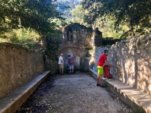Prve je to všechno odkryté a my jdeme ve vysoké trávě, asi v 9:30 začíná les a v 10 hod dojdeme do osady Lluc, což je jakési poutní místo, takže je tu hromada lidí. Máme za sebou 12 km. Čepujeme vodu ve svaté studánce, dáváme 10 min pauzu a pokračujeme dál.
