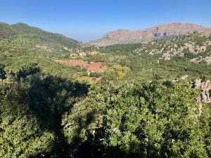 Pokračujeme dál. Z výšky 400 m stoupáme do 900 m. Tady se to trochu komplikuje. Postupujeme podle trasy, kterou David našel na serveru outdooractive.com. Většinu cesty kopíruje GR221, ale tady vede přímější a strmější cestou. Jenže hned zkraje narazíme na překážku – vlezem do jakési rezervace, kde nám pán v budce vysvětlí, že tam jít nesmíme a musíme to obejít. Takže nakonec si to zase tak moc nezkrátíme. Ale to nevadí. Je to hezká cesta lesem a nahoře se pak dostaneme na otevřenou zvlněnou plošinu. Procházíme přes mírný vrcholek ve výšce 900 m, dáme si krátkou technickou pauzu. Musel jsem aplikovat vazelínu a zafungovalo to perfektně.