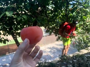 Cesta vedla ještě trochu oklikou. Když už jsme byli kousek od zástavby, potkali jsme nějaký ovocný strom. Tom šel otrhat pár plodů. Byly to kaki, ale byly tak zralý, že se to vůbec nedá srovnat s tím, co se dá koupit u nás v supermarketu. Konzistencí i sladkostí se to podobalo přezrálým meruňkám. Každý jsme si pochutnali na třech plodech.