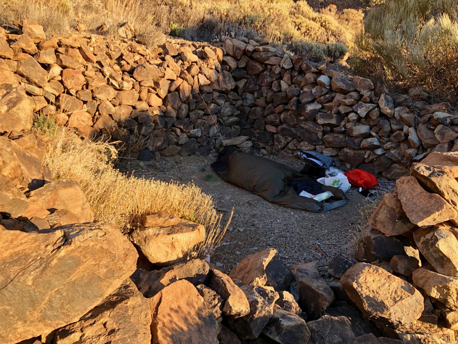 Kde já dnes přespím? Mohl bych si ustlat vedle chaty na vybetonovaném plácku. Ale to je hned u silnice a od aut by byl hluk. Nebo bych mohl přespat u té trubky, bylo tam takové místo, ale dost pochybné. Začnu scházet zpět k chatě a najednou si všimnu krásného místa na spaní – rovný plácek a kolem něj kamenná zídka. Super! Beru!