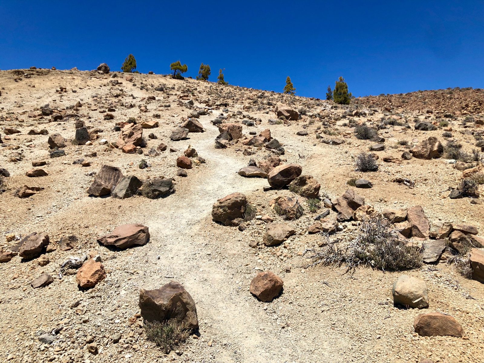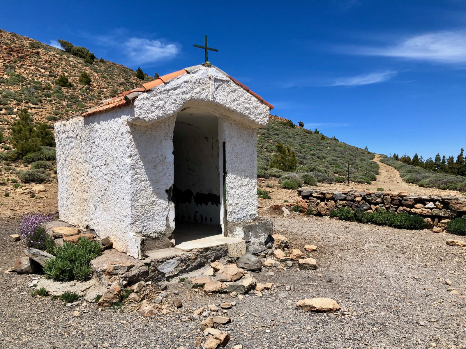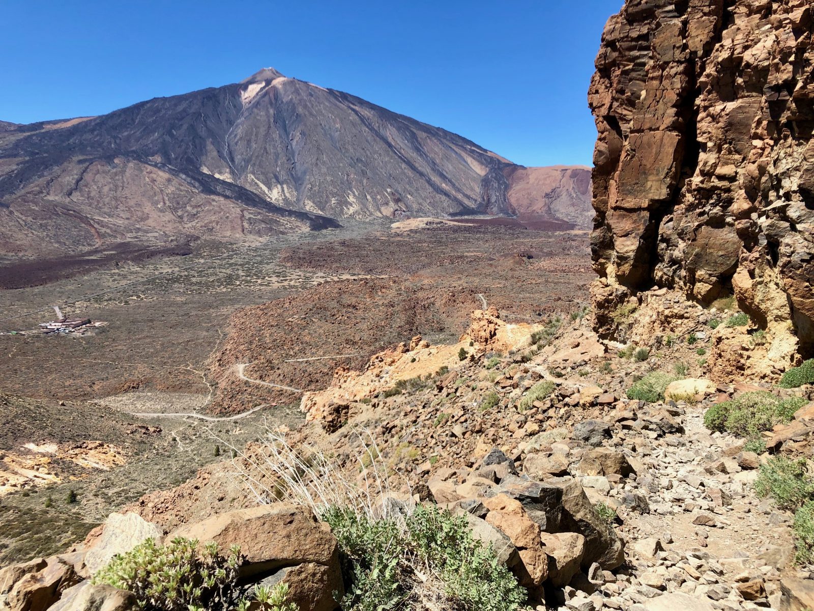 Pokračoval jsem dál vzhůru na hřeben. Tam jsem se konečně dostal asi ve 14:20. Najednou se mi odkryl pohled na Pico del Teide. Při výšce 3718 m je to nejvyšší hora Španělska. Mezi mnou a sopkou je rozlehlá kaldera, kudy vede silnice. Jdu po hřebeni směrem na východ, až dojdu na rozcestí a odtud klesám dolů k silnici, kde je odpočívadlo. Informační centrum je zavřené, ale aspoň tu seženu něco k snědku a na pití.