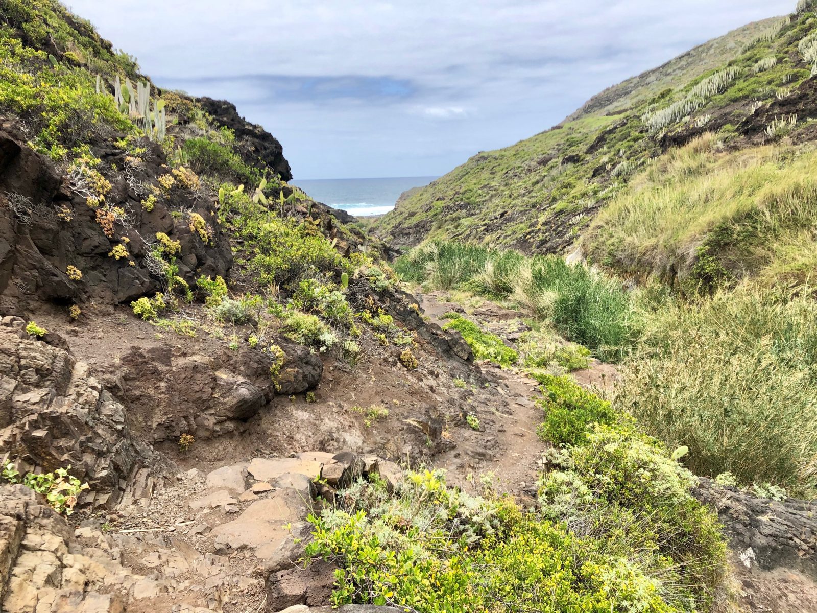 Pokračuju dál. Stezka je čím dál dramatičtější, dostávám se do takového kaňonu, který vede až na pobřeží. Vidím moře! Po cestě potkám prve jednu rodinku a pak těsně před pobřežím skupinu asi 20 francouzských turistů.