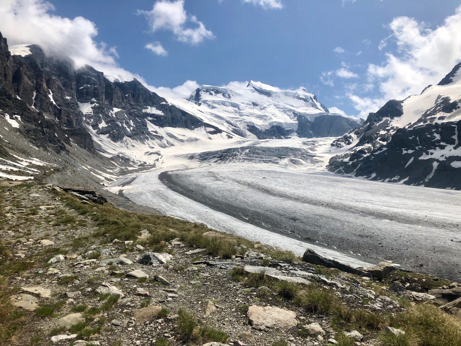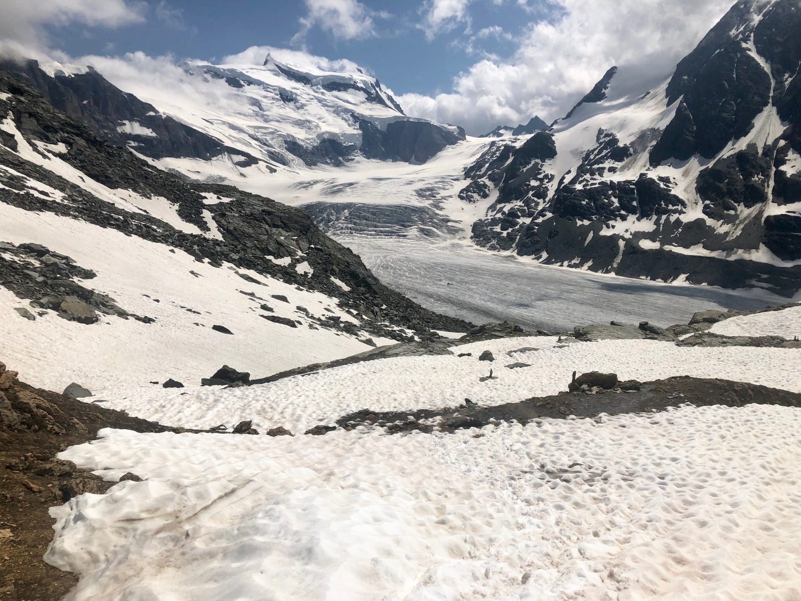 Teď už jen vylezu na okraj morény na druhé straně a za chvíli jsem na další chatě – Cabane FXB Panossière (2632 m). Je na luxusním místě. Na terase před chatou je posezení a výhled odsud je ještě lepší než z toho předchozího sedla. Člověk by tu mohl sedět hodiny a jen se kochat.