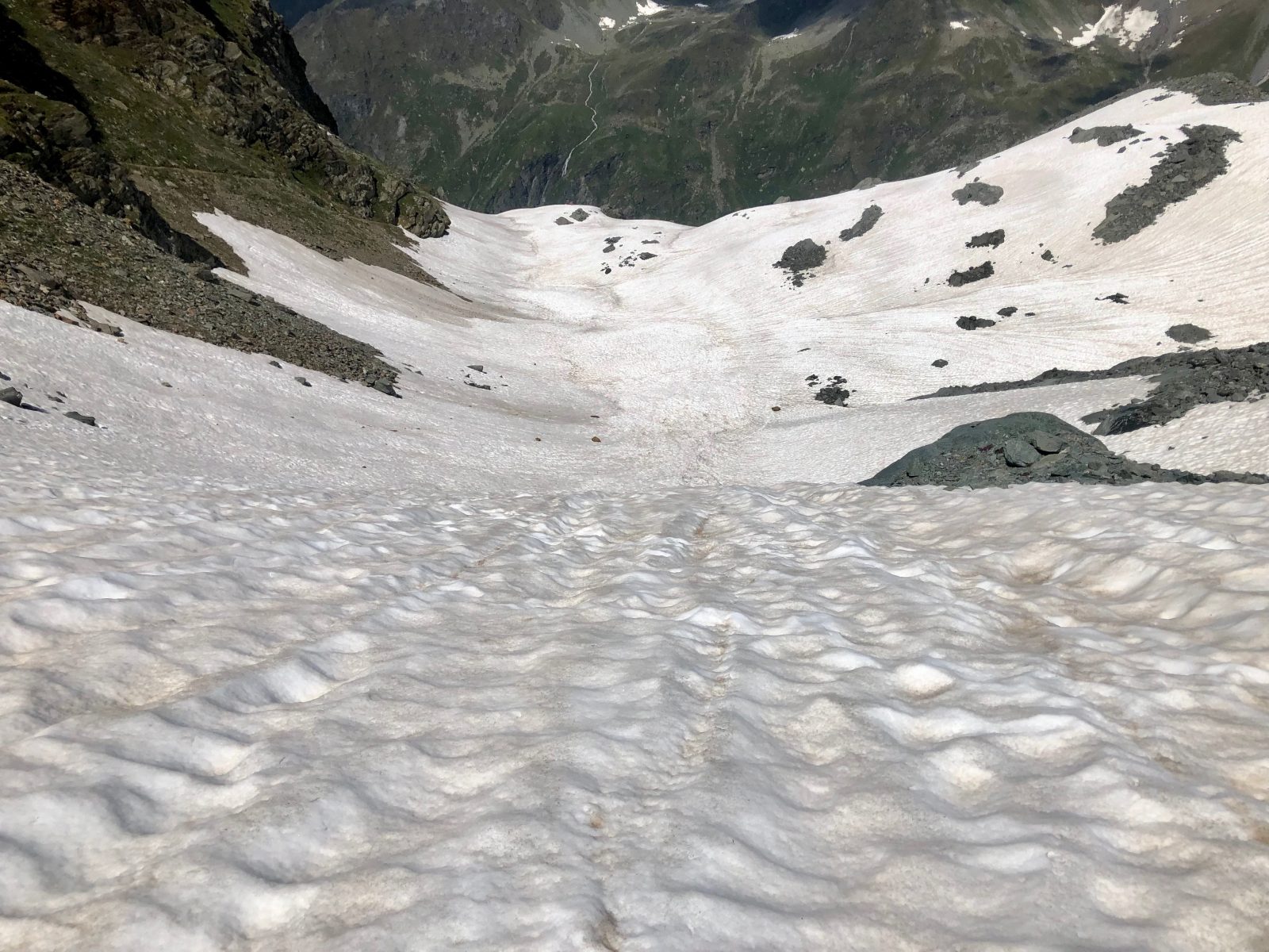 V sedle Col des Otanes (2845 m) jsem v 15:45. Na začátku sestupu na druhou stranu je krásný sněhový svah. Beru pro jistotu do ruky cepín a už jedu po zadku dolů. Uuuuuaaaa!