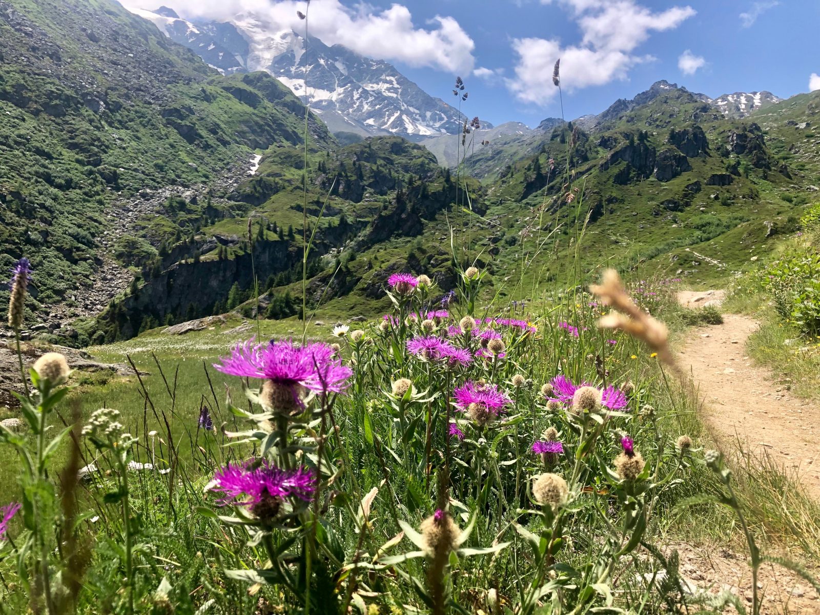 Stezka č. 6 by pokračovala dál okolo, ale já se rozhoduju jít přes sedlo. Už je zase docela hic. Stoupám vzhůru. Ve 13:51 jsem v sedle Col des Avouillons (2648 m) a zůstávám v úžasu. Najednou vidím, že na druhé straně sedla je ledovcové údolí táhnoucí se od vrcholu Grand Cobin (4314 m). Je to bomba. Budí to respekt.