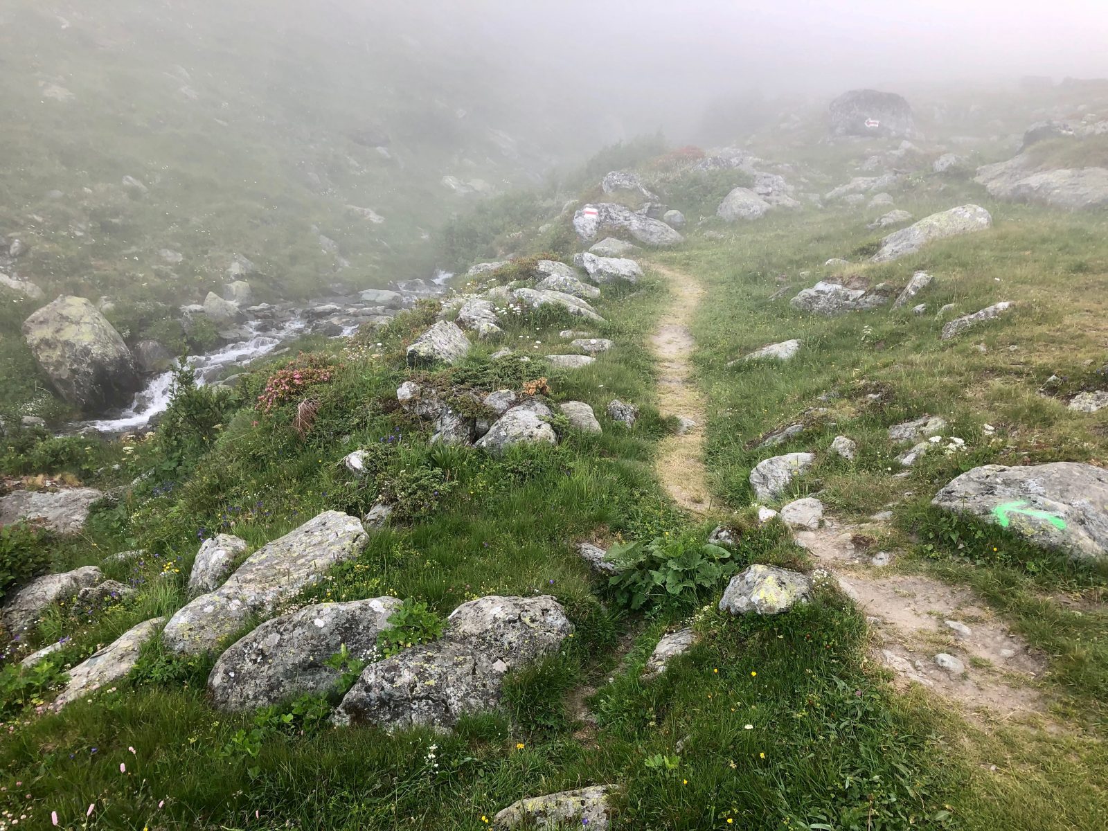 Vstávám, balím, snídám. Dochází mi jídlo, ale snad už to nějak zvládnu. V 7:30 vyrážím. Nad údolím se převaluje mlha. Začínám stoupat. Když jdu asi hodinu, dostanu se do mraku.
