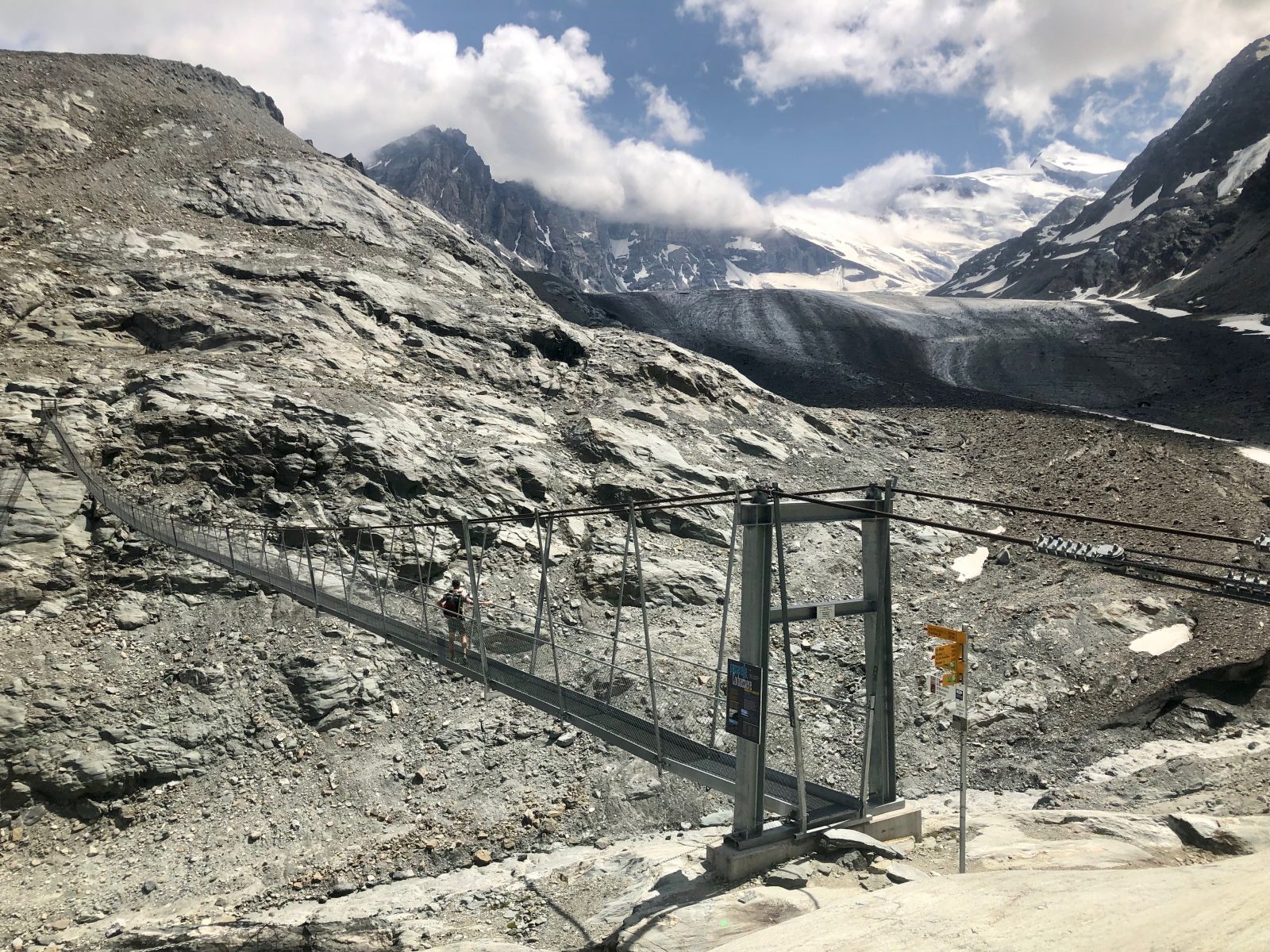 Musím sejít dolů a přejít přes visutý most, který vede přes ledovcovou řeku. Je celá zakalená. Most tu postavili v roce 2014. V popisku na webu píšou, že si tu budete připadat jak v Himálaji, a mají pravdu.