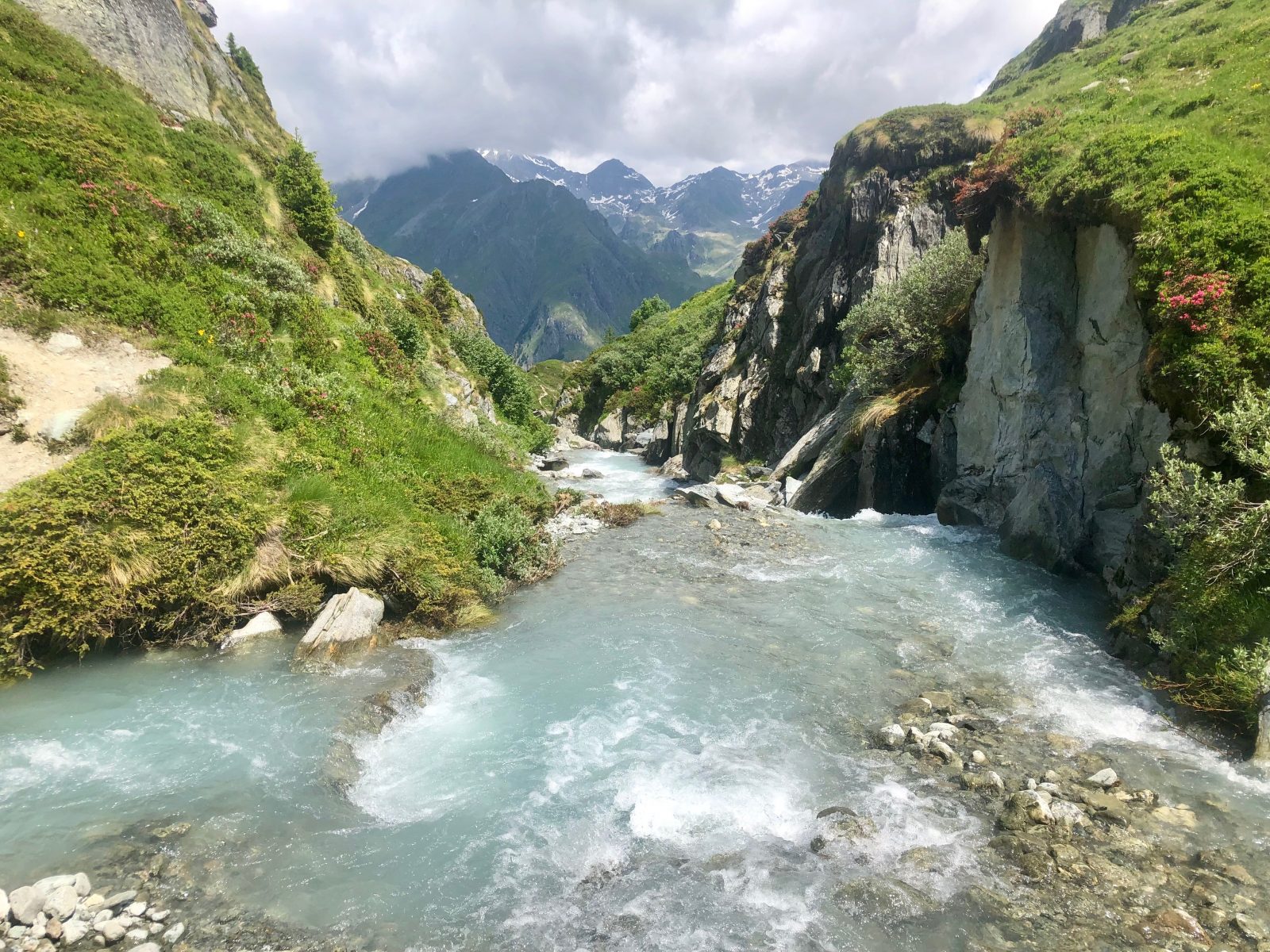 Pak už pokračuje klasická alpská cestička. Potřebuju sestoupit něco přes 1000 m až do údolí. Jde to hladce. Po chvíli se odpojuju na menší cestičku, protože ta vede níž do údolí, kam potřebuju. Tam mám domluvené ubytování a odtud zítra ráno sjedu autobusem na vlak a pak až do Ženevy. Trochu se obávám, aby ta menší stezka nebyla moc zarostlá, ale naštěstí je v dobrém stavu, takže dál pádím dolů.