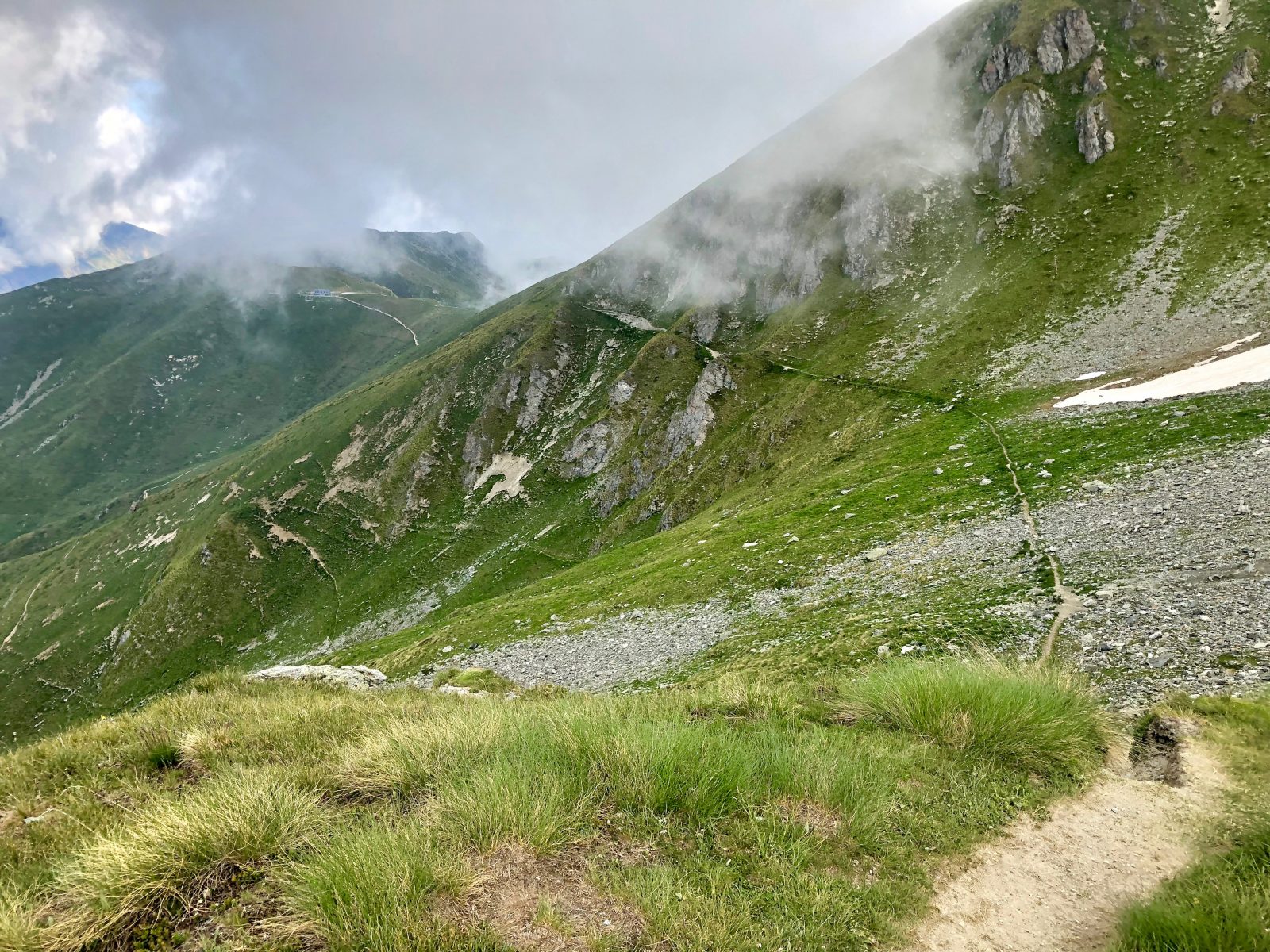 Cesta pořád traverzuje okolo horského masivu, až dojdu do sedla Col de Mille (2471 m), kde je chata. Je pořád docela zamračeno a chladno, takže se jdu trochu ohřát dovnitř. Dávám si sendvič. Je to docela hezká moderní chata. Akorát teda mi přijde hrozně blízko civilizace – mně to sem trvalo 2,5 hod, ale dá se sem dojít určitě i výrazně kratší cestou odjinud.
