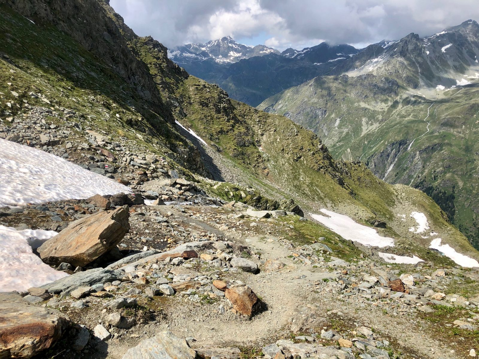 Dávám rychlou svačinu a pokračuju dál. Čeká mě poslední sedlo. Jdu po okraji morény směrem k hoře a pak odbočuju do svahu nalevo. S chutí do toho a půl je hotovo. Jak se blížím k nejvyššímu bodu, přibývá sněhu.